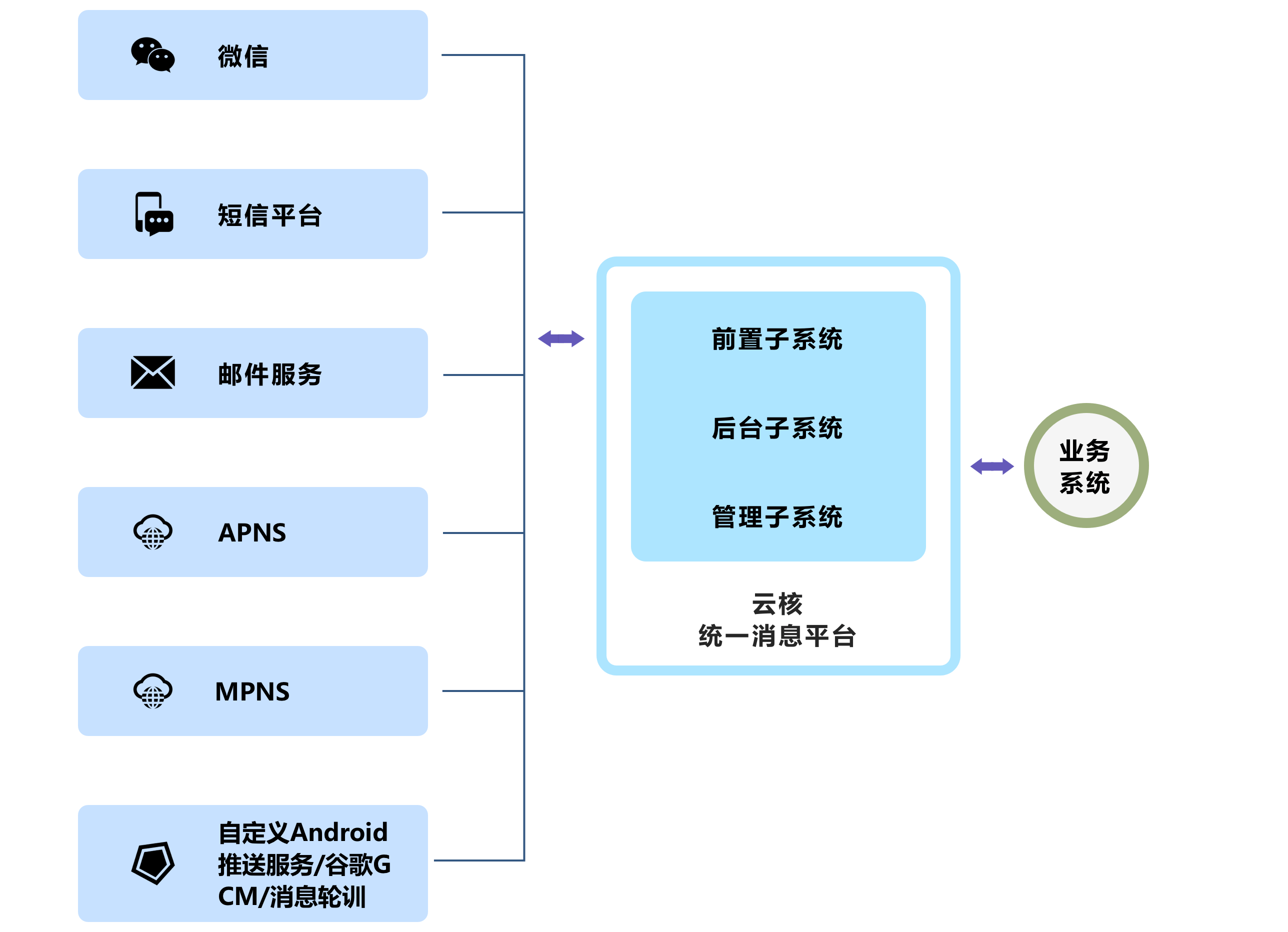 随着移动互联网的发展,金融业务中出现大量推送消息,比如:业务通知、安全码通知、动账通知、营销推广等,消息推送俨然成为了用户生活的一部分。除了传统的短信消息,APP应用消息、微信公众号消息、QQ公众号消息等类型相继出现,今后还将可能出现更多的消息类型。如果没有统一的消息平台,一方面,系统各自对接各消息渠道,导致重复开发,另一方面,还可能造成同一消息在不同渠道间重复推送的情况,这既造成资源浪费,又影响客户体验。